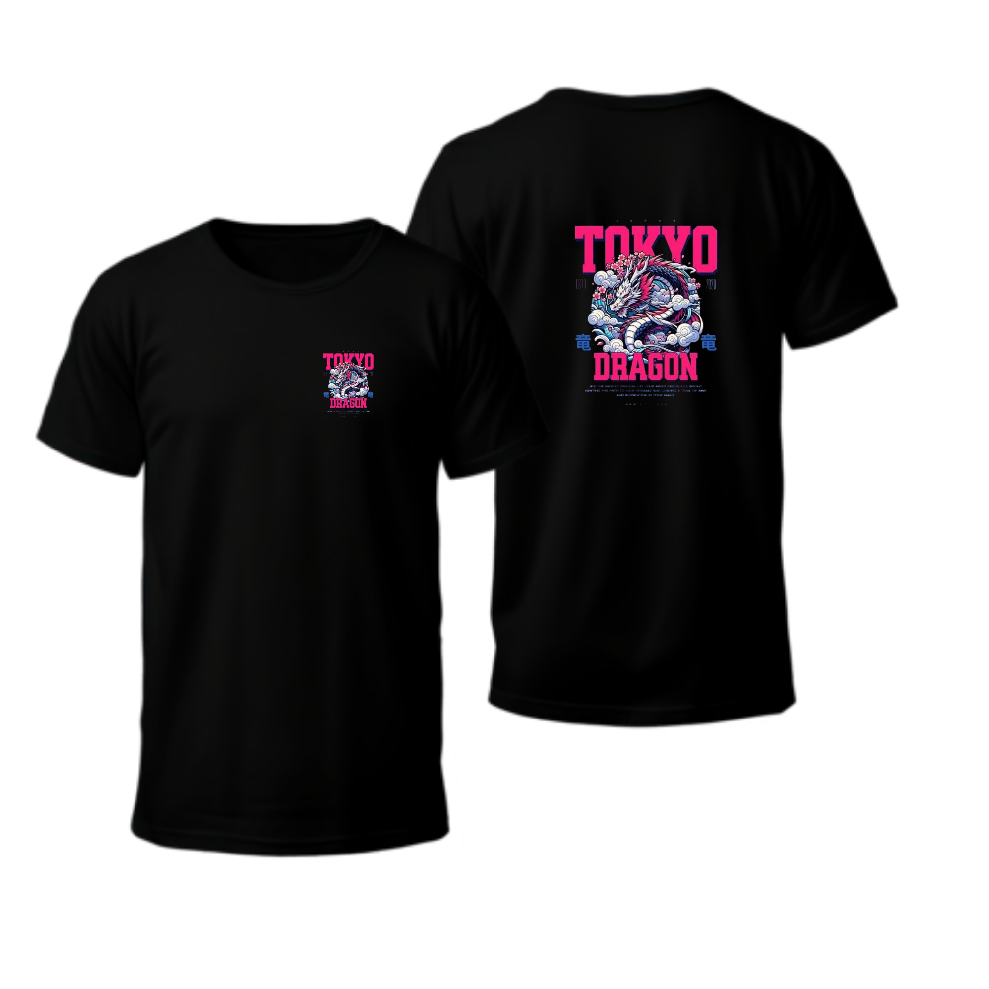 T-shirt που παρουσιάζει ένα δυναμικό και καλλιτεχνικό σχέδιο ενός δράκου, πλαισιωμένου από την επιγραφή "TOKYO" στο πάνω μέρος και "DRAGON" στο κάτω, με ιαπωνικά στοιχεία να συμπληρώνουν την εικόνα. Το σχέδιο επαναλαμβάνεται διακριτικά στο μπροστινό μέρος, ενώ η μεγαλύτερη εκδοχή του κοσμεί την πλάτη.
