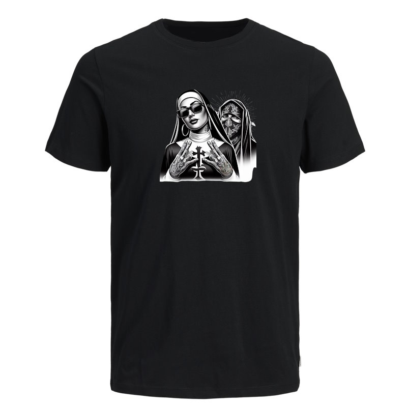Αυτό το μπλουζάκι διαθέτει ένα εντυπωσιακό σχέδιο που παίζει με τις αντιθέσεις. Μια μοναχή με τατουάζ και γυαλιά ηλίου αποπνέει μια επαναστατική στάση, ενώ το κρανίο πίσω της προσθέτει ένα στοιχείο μυστηρίου.